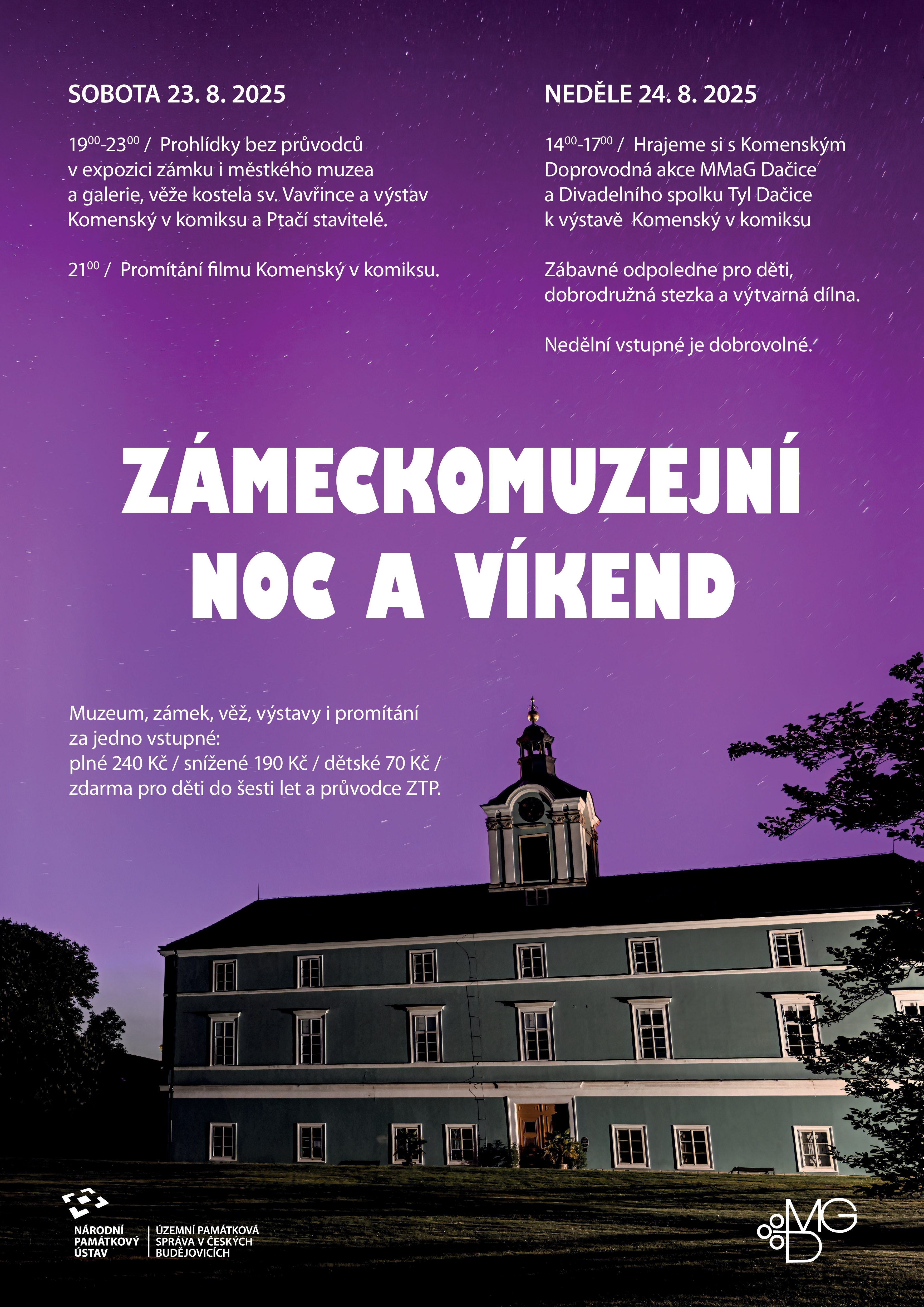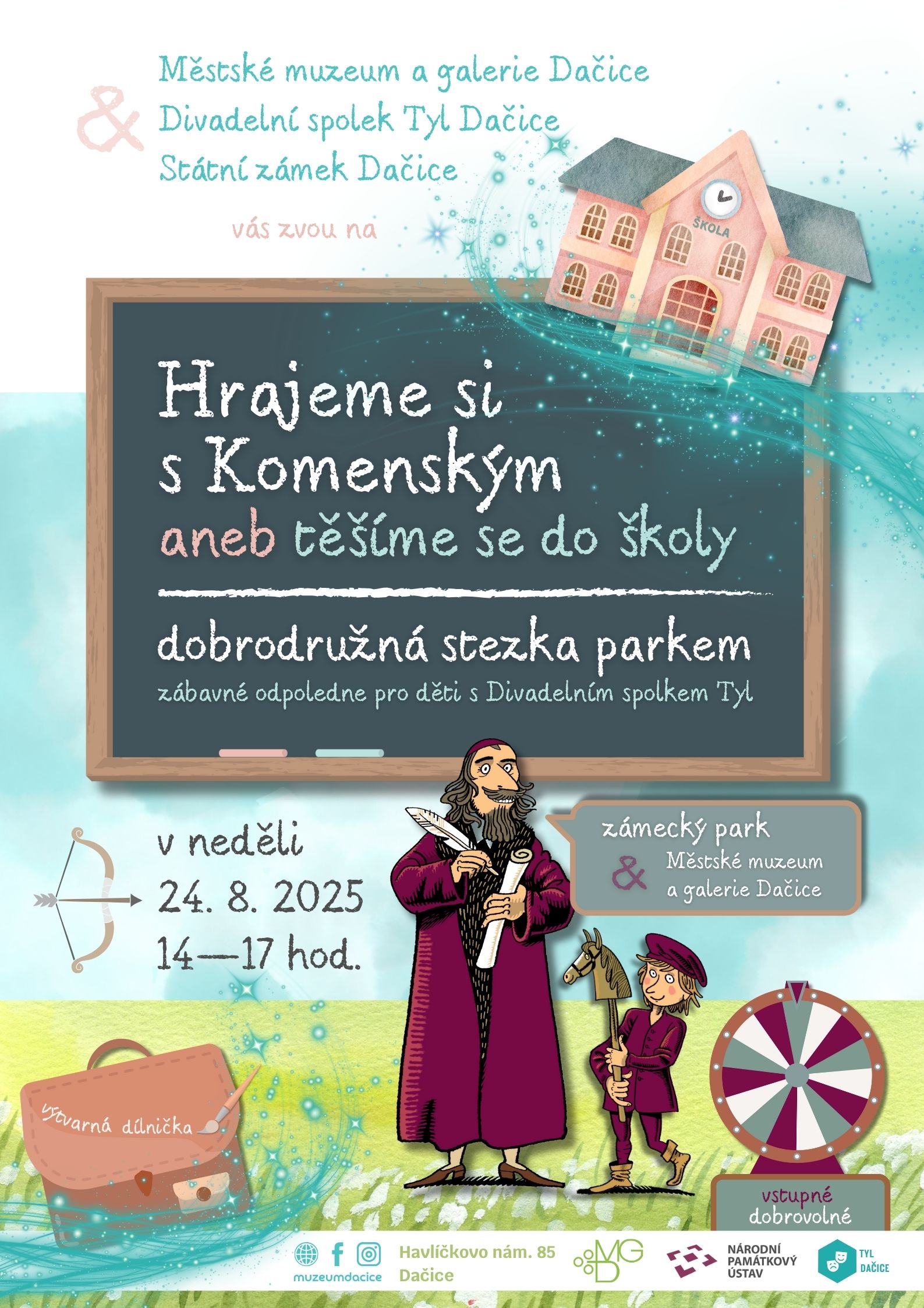 V neděli po "zámeckomuzejní noci" se uskuteční v zámeckém parku zábavné odpoledne pro děti. Těšit se můžete na dobrodružnou stezku se zajímavými úkoly, výtvarnou dílničku, interaktivní výstavu pro celou rodinu ve výstavních prostorách muzea a možná i překvapení. Program bude tematicky navazovat na letní výstavu Komenský v komiksu, která je toto léto k vidění v MMaG Dačice.
